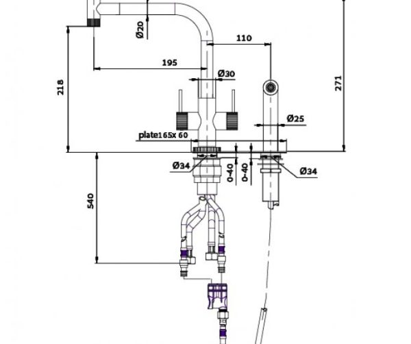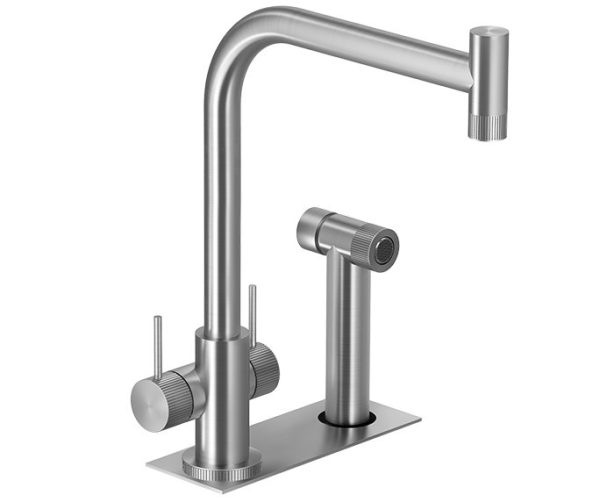 נוב ברז מטבח נירוסטה שתי ידיות ופיה אופקית מסתובבת, מתז צד אינטגרלי , מצב זרימה אחד.